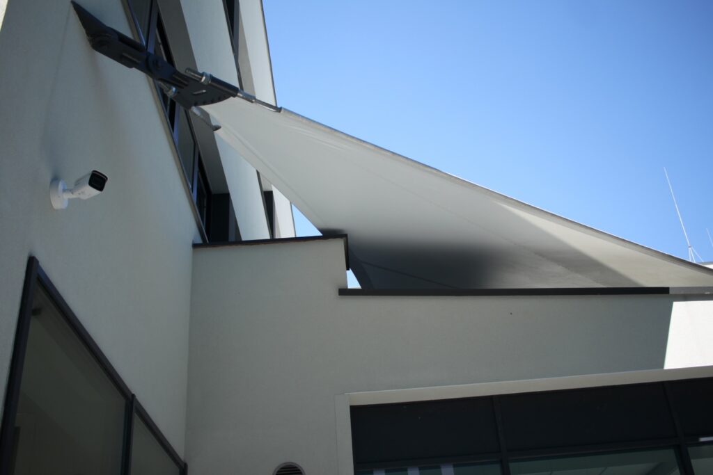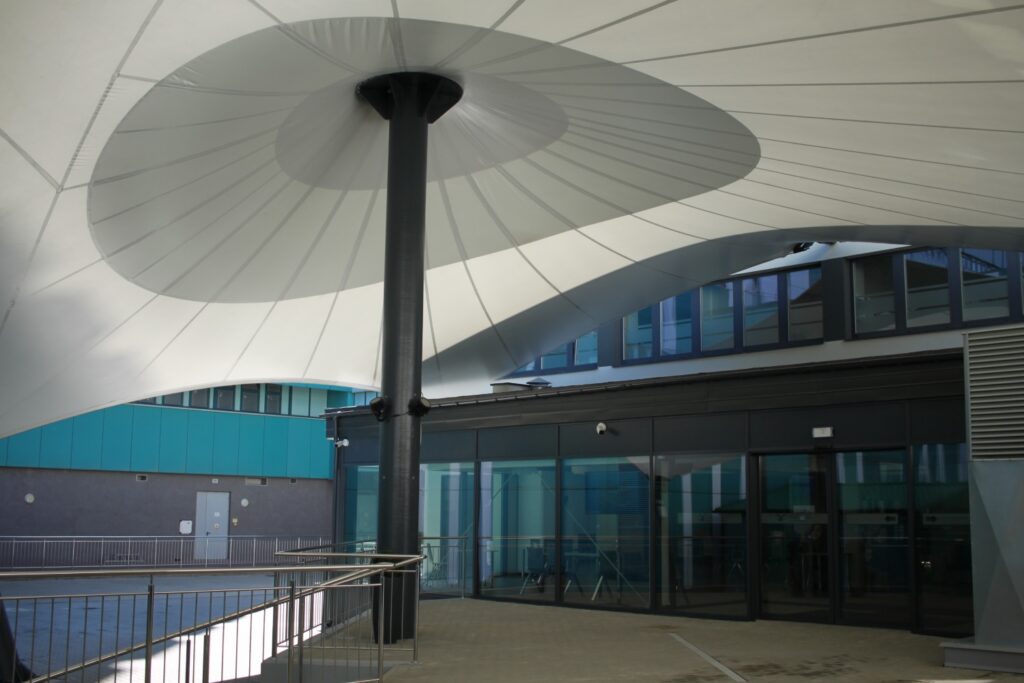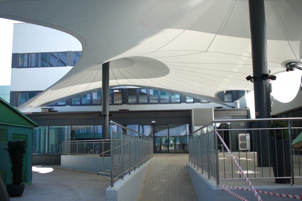 Zadaszenie ma kształt podwójnej formy stożkowej, wspartej na wewnętrznych podporach, co nadaje mu nowoczesny i lekki wygląd. Konstrukcja została umiejscowiona w narożniku między dwoma ścianami budynku, co efektywnie wykorzystuje dostępną przestrzeń. Od strony elewacji zadaszenie jest zakotwiczone punktowo w ścianie, a od zewnątrz przymocowane do dwóch pochyłych słupów, zapewniających stabilność i bezpieczeństwo konstrukcji.