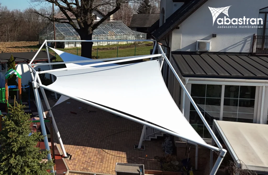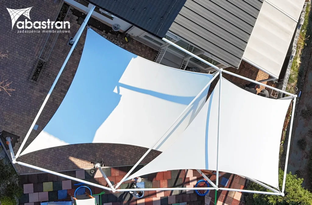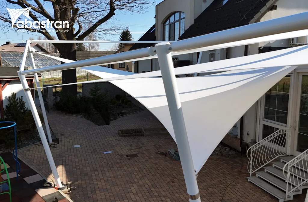 Pokrycie o powierzchni 71 m² zostało wykonane z odpornej na warunki zewnętrzne membrany PVC. Konstrukcję nośną stanowią stalowe słupy o przekroju okrągłym, do których naciągnięto membranę w sposób gwarantujący stabilność i trwałość rozwiązania.