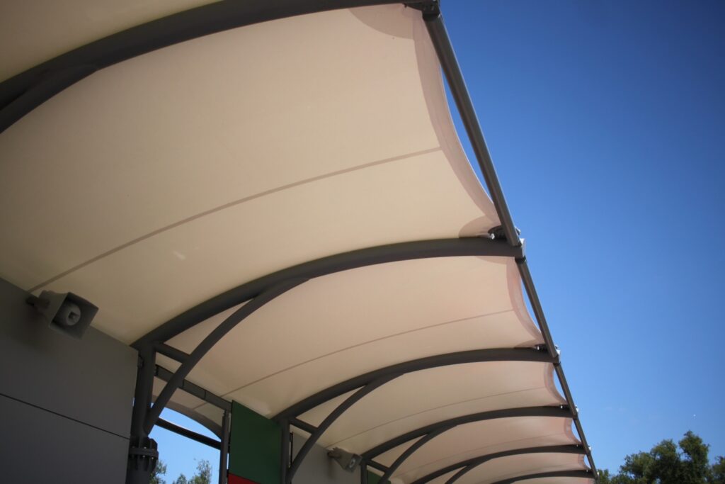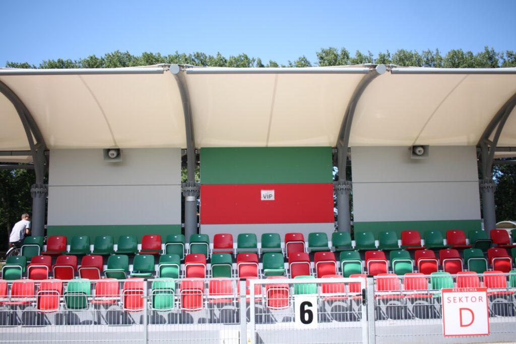 Membrana użyta w konstrukcji jest wysoce odporna na UV i inne czynniki zewnętrzne, co zapewnia jej długotrwałość i minimalizuje potrzebę częstej konserwacji. Dzięki zastosowaniu lekkich, ale wytrzymałych materiałów, zadaszenie doskonale komponuje się z nowoczesnym charakterem obiektu sportowego, nie obciążając przy tym nadmiernie konstrukcji trybun.