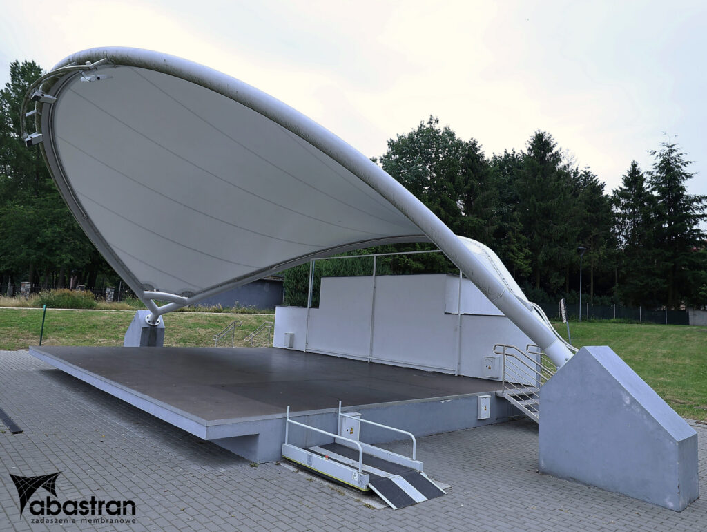 Przekrycie membranowe sceny zapewnia ochronę przed słońcem i deszczem, co umożliwia organizowanie wydarzeń kulturalnych w różnych warunkach pogodowych. Biała, fluorowana membrana zapewnia również doskonałe rozproszenie światła, co jest istotne podczas występów na scenie. Interesują Cię nowoczesne rozwiązania dla przestrzeni kulturalnych? Sprawdź naszą ofertę projektowania konstrukcji membranowych.