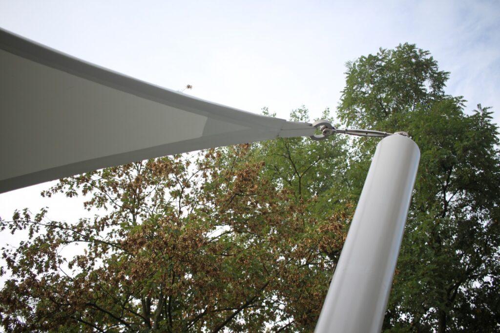 Do projektu wybrano materiał Mehler FR 1400 MEHATOP F – Type IV, który znany jest z wysokiej odporności na promieniowanie UV, wpływy atmosferyczne i uszkodzenia mechaniczne. Jest to tkanina poliestrowa powlekana PCV, która idealnie nadaje się do stosowania w miejscach publicznych ze względu na swoją trwałość i łatwość konserwacji.