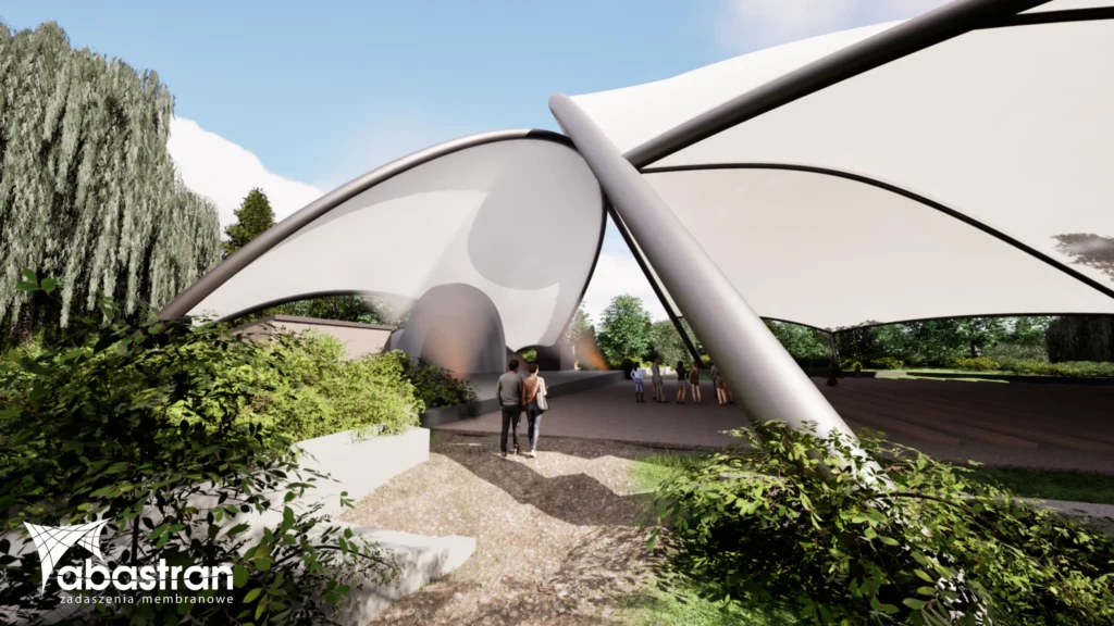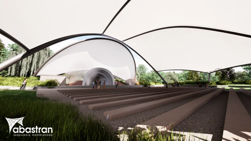 Projekt zakłada harmonijne i naturalne połączenie dwóch zadaszeń w wielkoskalowe przekrycie dla komfortu i funkcjonalności amfiteatru niezależnie od czynników atmosferycznych.