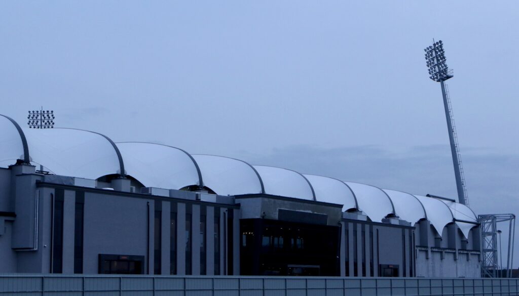 Do budowy zadaszenia wykorzystano membranę Mehler Valmex FR 1000 Mehatop F, PVC, znany z wysokiej trwałości i odporności na warunki atmosferyczne. Łączna powierzchnia membrany wynosi około 1800 m². Konstrukcja stalowa została zaprojektowana tak, aby zapewnić maksymalną stabilność i bezpieczeństwo użytkowania stadionu, jednocześnie minimalizując wpływ na widoczność i estetykę całego obiektu.