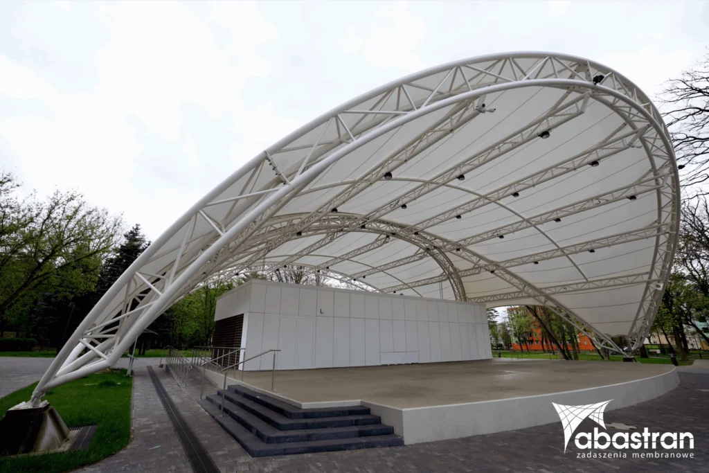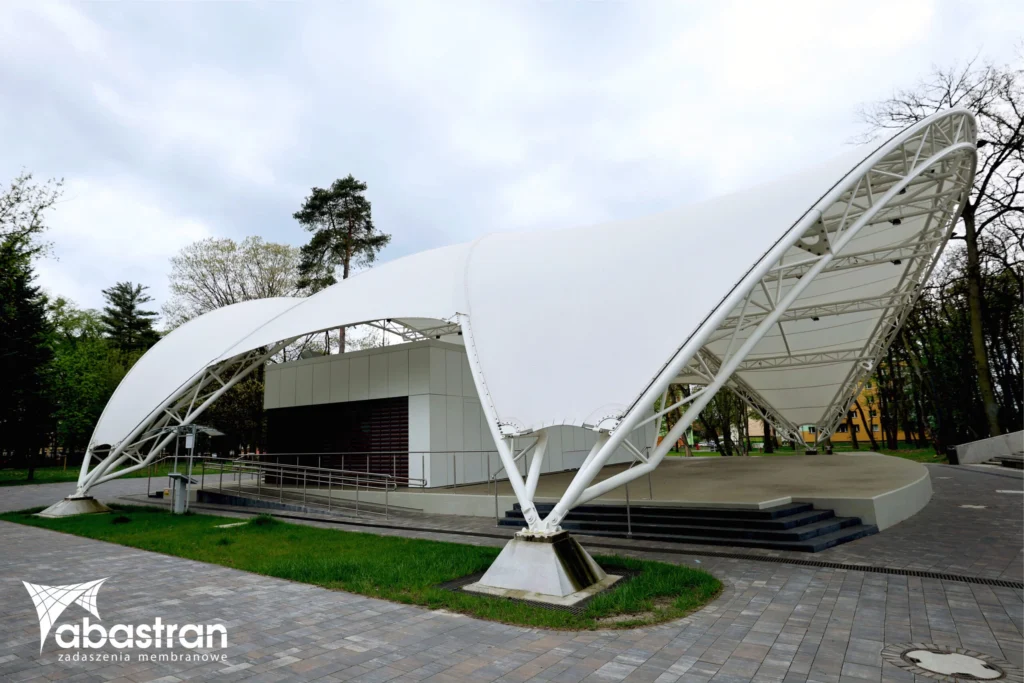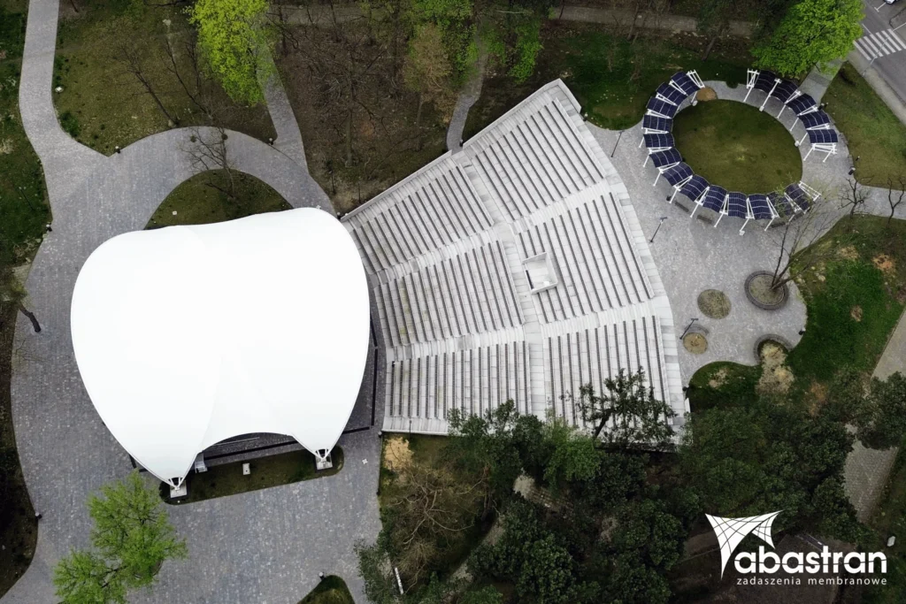 Zadaszenie sceny amfiteatru zostało zaprojektowane z myślą o harmonijnym dopasowaniu do przestrzeni parkowej. Forma konstrukcji nawiązuje do organicznych kształtów skweru i naturalnej linii widowni, tworząc lekką, a zarazem efektowną przestrzeń dla wydarzeń plenerowych.