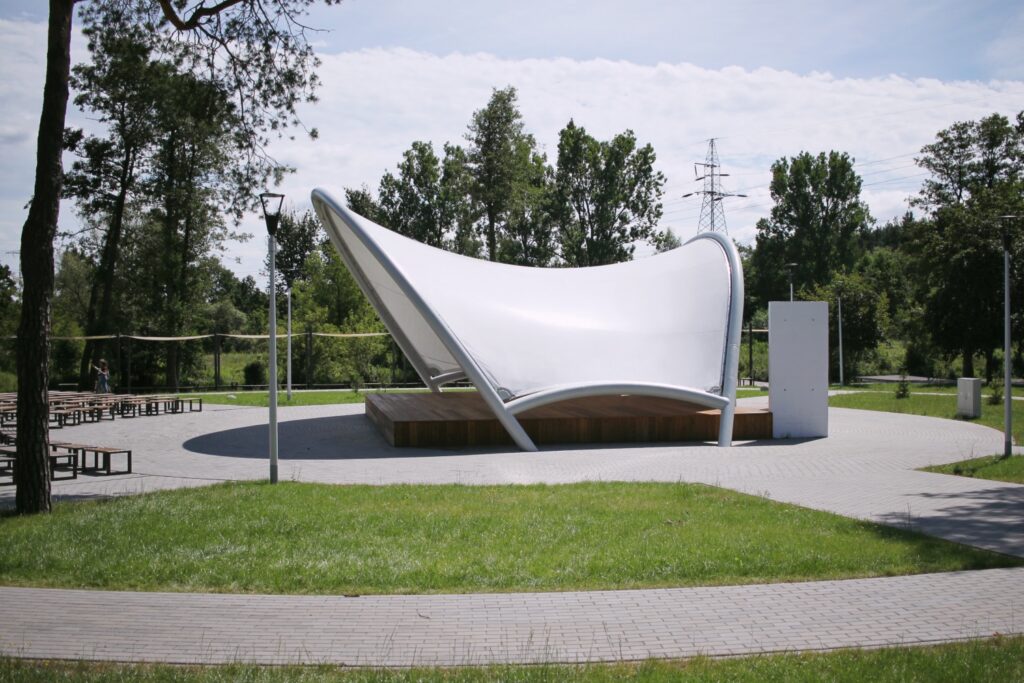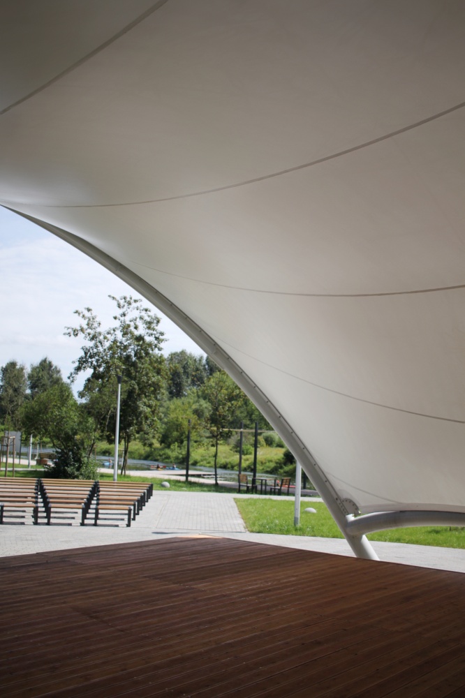 Przekrycie dachowe zaprojektowane zostało jako trwałe i estetyczne zadaszenie membranowe, które z powodzeniem komponuje się z otaczającą przyrodą. Jego unikalna forma przypominająca siodło nie tylko stanowi interesujący element architektoniczny, ale również efektywnie chroni przed różnymi warunkami atmosferycznymi, co pozwala na organizację wydarzeń kulturalnych przez cały rok.
