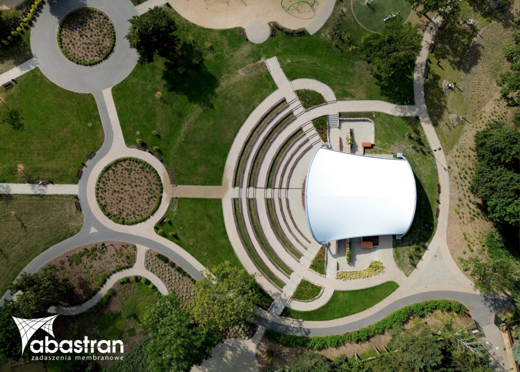 Zadaszenie zostało zintegrowane z półkolistą widownią, nawierzchnią z kostki brukowej, otaczającą zielenią i ścieżkami spacerowymi. Stanowi harmonijną całość wkomponowaną w przestrzeń publiczną, podnosząc standard organizacji wydarzeń plenerowych.
