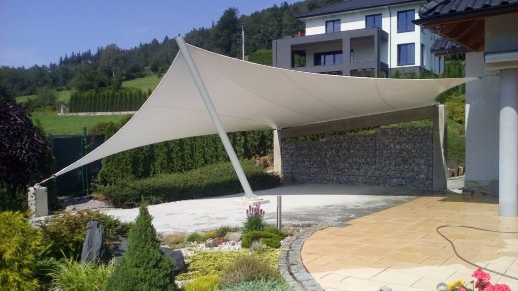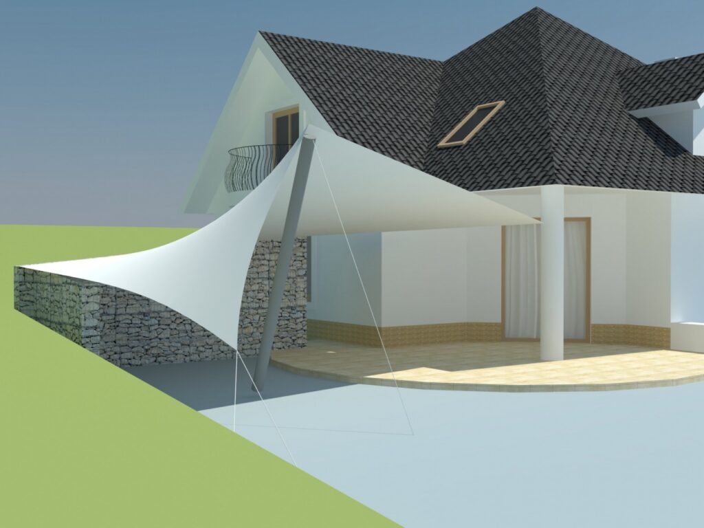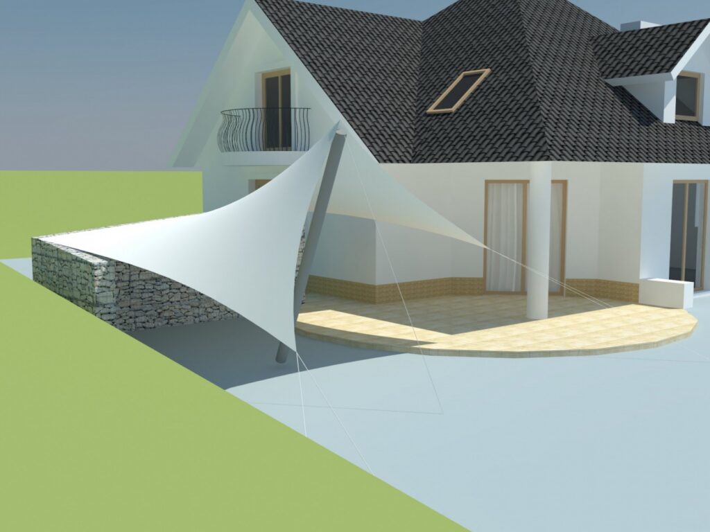 Zadaszenie wykonano z membrany PVC z włóknami PES, co zapewnia wytrzymałość, trwałość i odporność na czynniki atmosferyczne. Konstrukcja zadaszenia opiera się na jednym słupie stalowym, dwóch odciągach oraz dodatkowo na konstrukcji żelbetowej z belką napinającą. Całość uzupełniają gabiony, które zostały zintegrowane z konstrukcją żelbetową, nadając projektowi unikalny i estetyczny wygląd. Zadaszenie ma maksymalne wymiary w rzucie z góry nieco ponad 8 m, przy maksymalnej wysokości około 3,5 m.